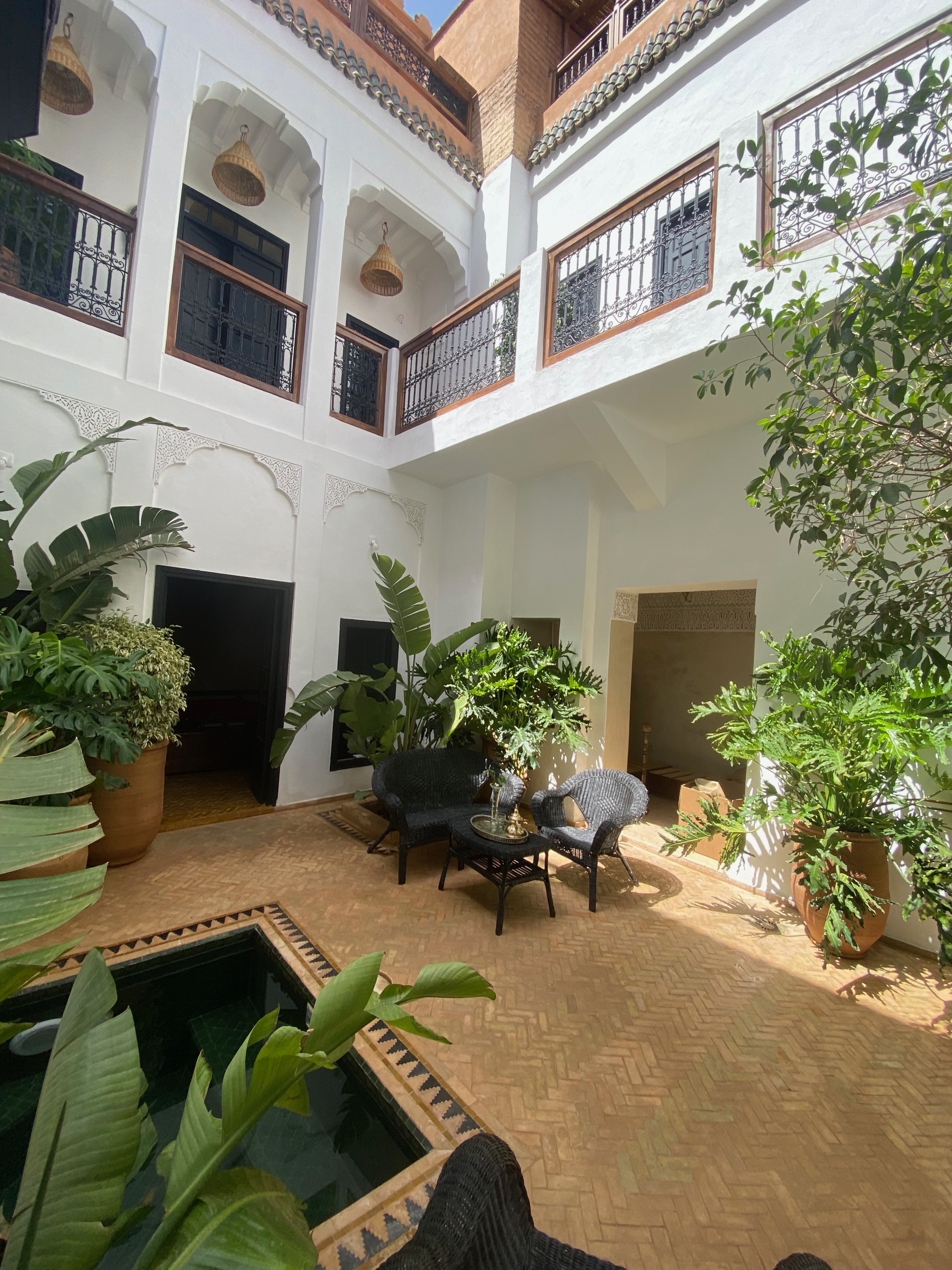 The central patio, with its luxuriant plants and small pool (1.5 x 2m - Depth: 0.5 to 1.2m) invites you to relax. The pool is unheated, but the perfect spot after the summer heat. The Bhou, an outdoor space where you can relax, perhaps with a moroccan mint tea in the shade, completes the serene atmosphere.